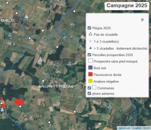 Consultez les résultats sur une carte interactive pour visualiser les parcelles prospectées avec leur éventuelle contamination et le nombre de ceps concernés. Pour chaque piège, le nombre de cicadelles est indiqué.